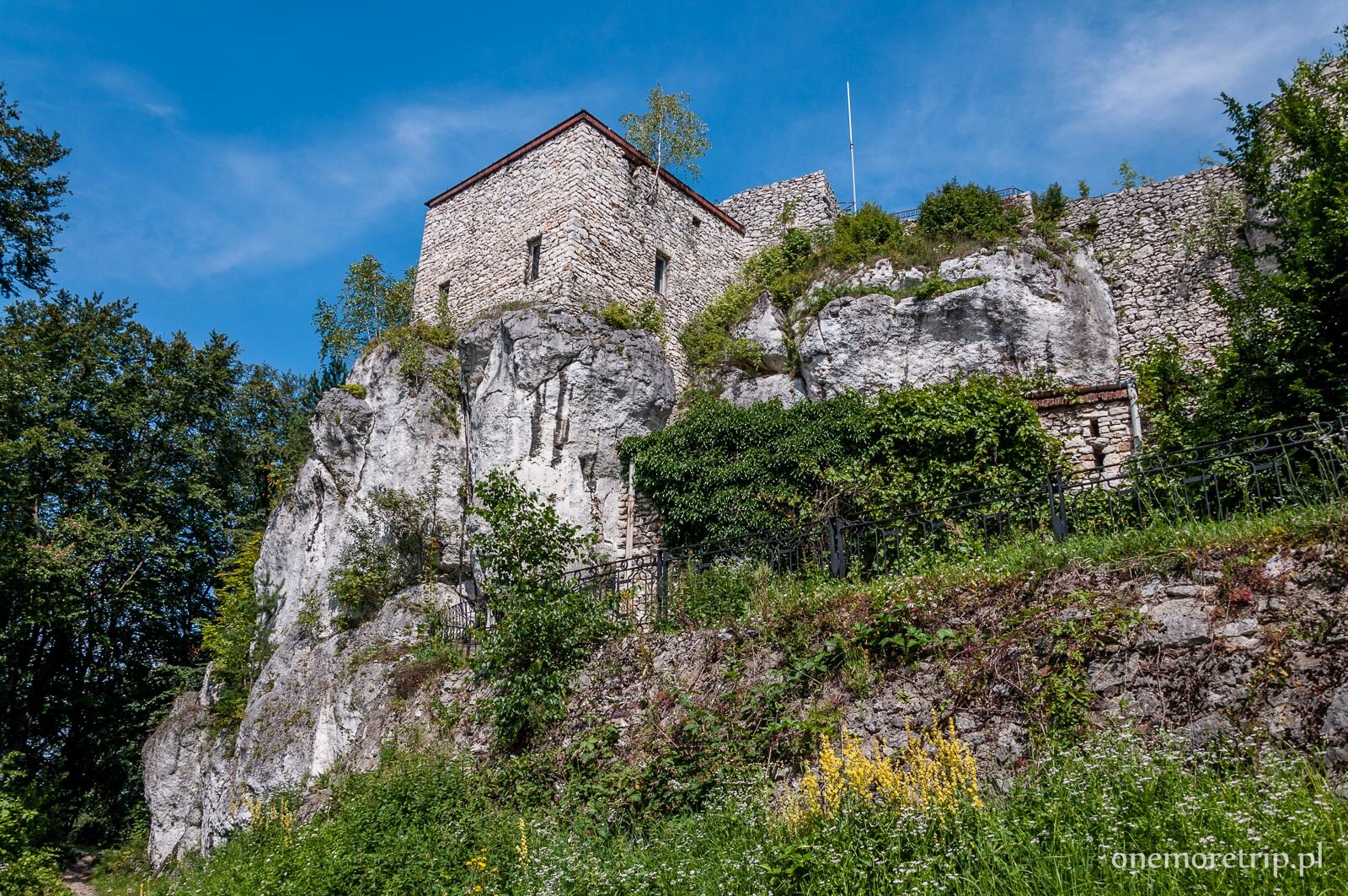 Niedaleko znajduje się nasz kolejny cel – ulokowane na skałach ruiny średniowiecznego zamku Ostrężnik. Z całej budowli pozostały tylko resztki murów porośnięte lasem. Łatwo właściwie przejść obok i nawet się nie domyślić, że stała tu warownia. Gdzieś miedzy kamieniami miał być ukryty kesz, jednak nie udało nam się go znaleźć.